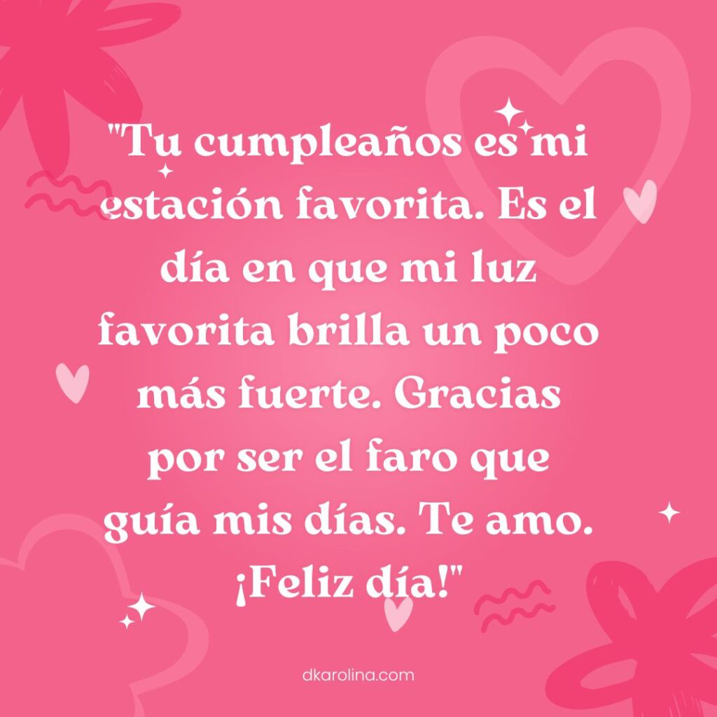 91.-«Tu cumpleaños es mi estación favorita. Es el día en que mi luz favorita brilla un poco más fuerte. Gracias por ser el faro que guía mis días. Te amo. ¡Feliz día!»
