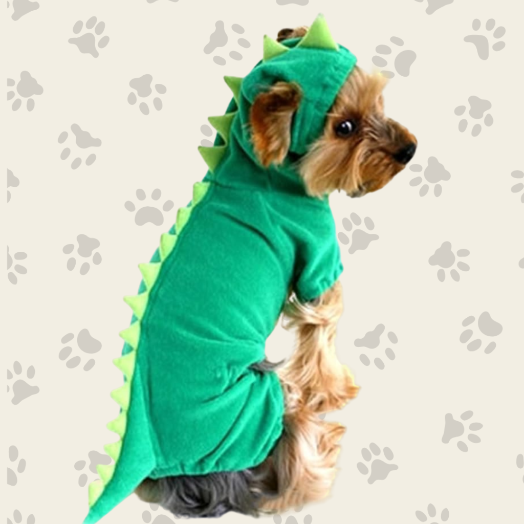 ¿Tu perro es un explorador nato?. El disfraz de dinosaurio (normalmente un tierno T-Rex) tiene una textura escamada y capucha ajustable.