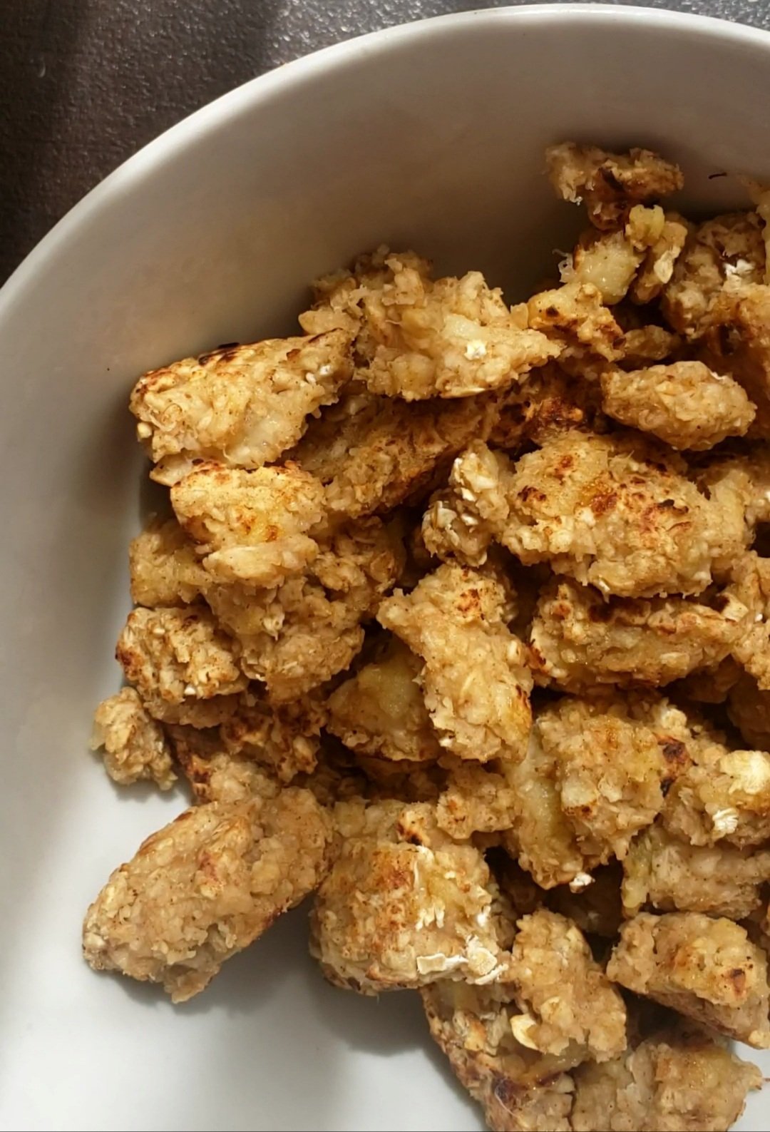 Por ultimo en una sartén (que sea antiadherente es importante), vamos a poner la mezcla y vamos a fragmentarla con la espátula en pequeñas partes, tenemos que ir moviendo de vez en cuando para que se valla cocinando de todos lados, nuestro cereal esta listo cuando estén dorados.