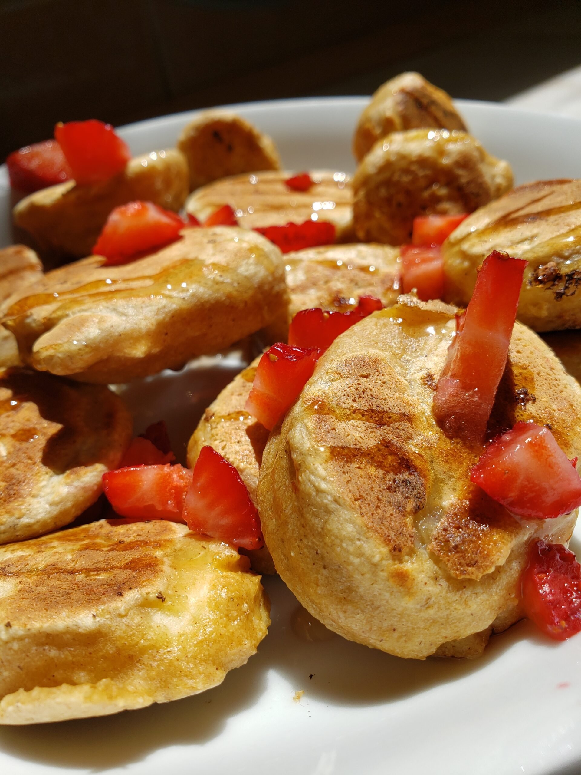 Para acompañar yo le agregue miel de maple y fresas, enserio están muy ricos estos mini panqueques rellenos de plátano, espero a que te animes a prepararlos.
